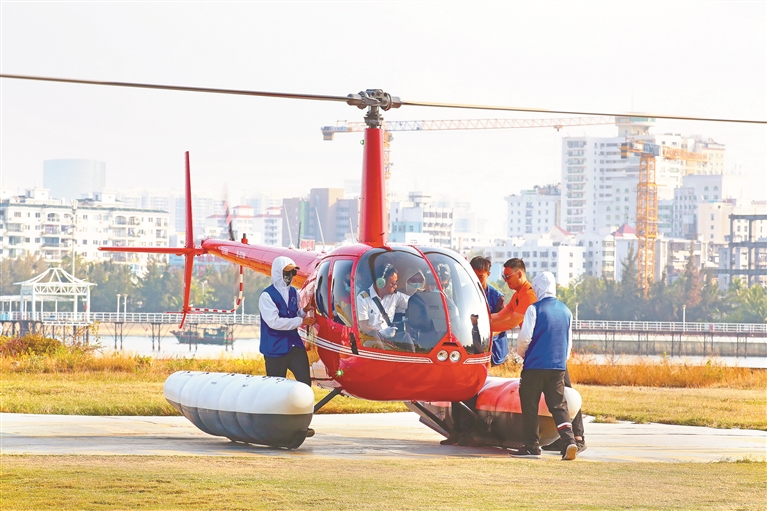 海南省三亚市凤凰岛,游客正准备搭乘直升机进行低空游。图片来源:视觉中国