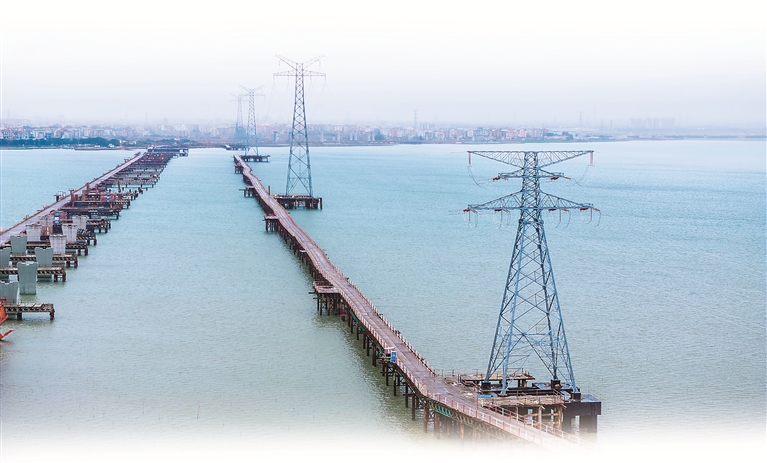 “普通的海上铁塔距离岸边只有几十米,一基铁塔配套修一小段栈桥,就可以满足施工条件。但这项工程有5基铁塔横跨2.8公里海域,且有通航航道,必须修建超长栈桥。”林致远说,施工团队为此还向路桥建设团队“取经”,填补了有关技术空白。