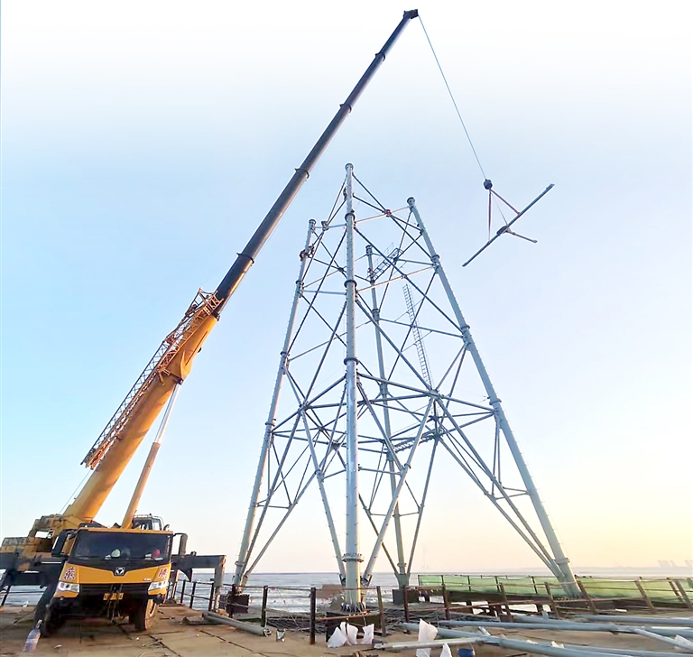 同时,得益于钢栈桥的建设,吊车有了施工平台。施工人员以流水化作业方式,在地面上将塔材进行组装,完成锁紧螺栓、紧固检查等工序,再用吊车平稳起吊送至高空拼接。塔上的施工人员将组装好的塔材与已经安装好的主材管柱通过螺栓牢牢固定在一起。这样既减少了高空作业量,降低了作业风险,海上铁塔组立效率也得到不断提高。记者了解到,如果没有这个平台,组立铁塔需要船只运输及船吊,受涨退潮影响,完成一组铁塔的组立用时将超一个月。而有了钢栈桥施工平台,组立一组铁塔可在7-10天内完成。