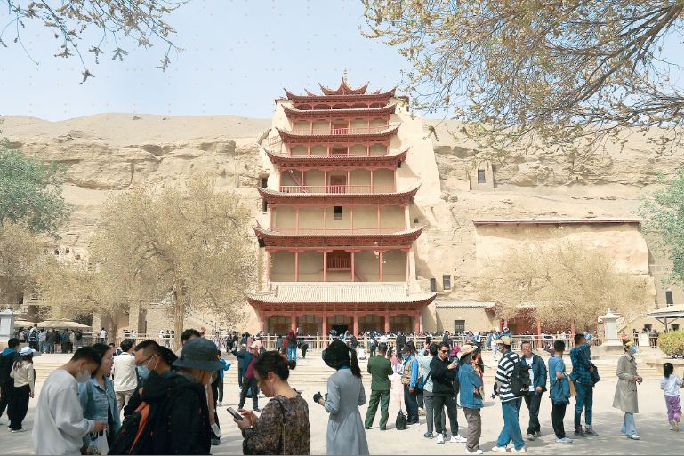 今年以来,甘肃省敦煌市深入推进文化和旅游深度融合发展,通过开展敦煌文化研学季活动、加强旅游宣传促销等多项措施,吸引众多游客。图为游客在莫高窟景区游览。 图片来源:视觉中国