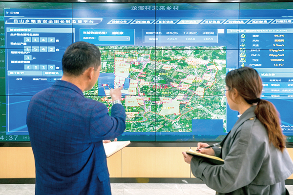 浙江省湖州市长兴县吕山乡龙溪村,技术人员正在通过数字粮田监测平台进行数据收集、分析。图片来源:视觉中国