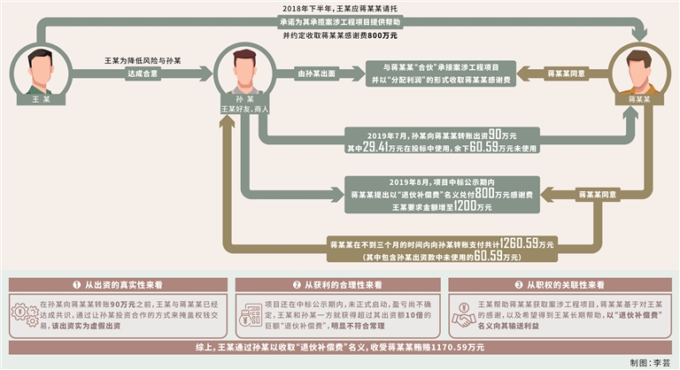 最后,从职权的关联性来看,受贿的本质是权钱交易,实践中,国家工作人员受贿案件中涉及的经营活动往往与其职权范围密切相关,国家工作人员能够利用本人职权或者职务上的影响在审批、拨款、政策支持等方面为经营活动提供帮助。本案中,王某在帮助请托人蒋某某获取案涉工程项目后,通过孙某出面获得蒋某某1170.59万元受贿款。就蒋某某而言,表面上是其给予孙某的“退伙补偿费”,实质是其基于对王某在案涉工程项目方面给予的帮助,以及希望继续得到王某长期帮助的回报;对于王某来说,实质是以孙某投资后退伙的名义收受蒋某某贿赂。因此,王某、蒋某某的行为实为权钱交易,王某获得的1170.59万元与职权行使具有直接关联。