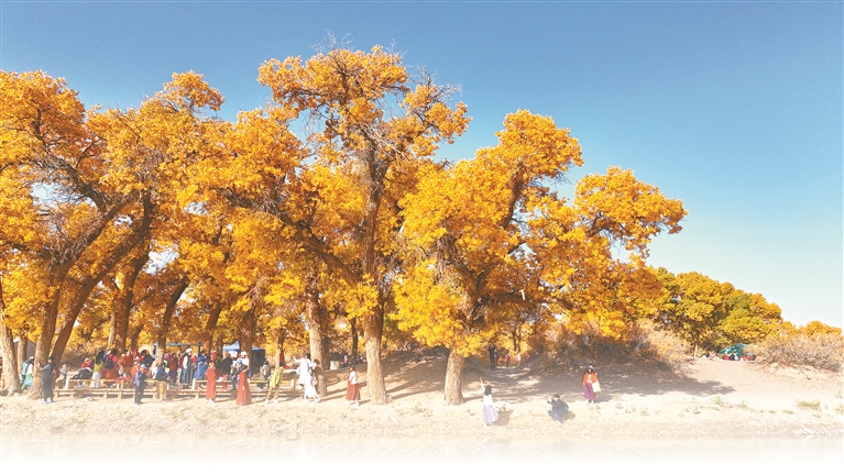 新时代以来,覆盖全面、务实管用、严格严密的中国特色社会主义生态环境保护法律体系初步形成,有力保障了生态文明体制改革的深入推进。图为游客在内蒙古自治区阿拉善盟额济纳旗额济纳胡杨林旅游区游玩。新华社发