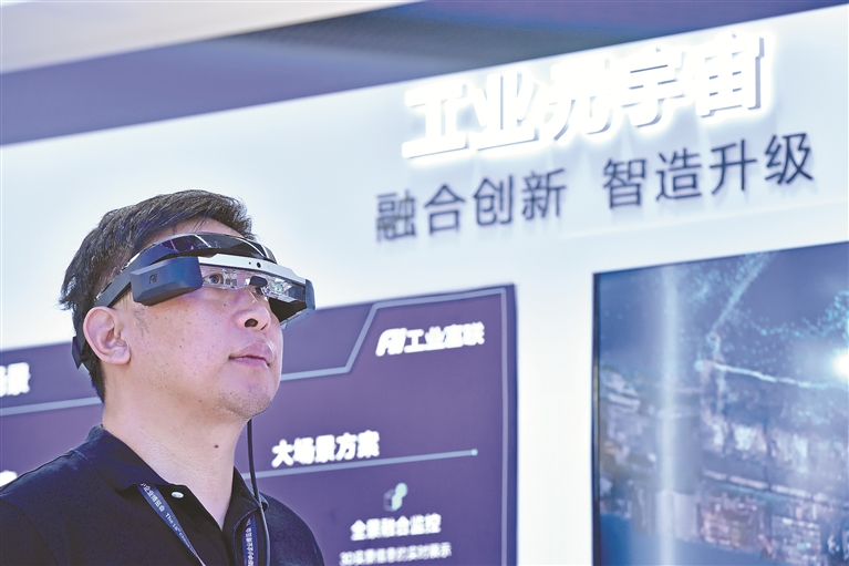 第十八届中国国际中小企业博览会上,戴上AR眼镜的工作人员正在展示“工业元宇宙”的应用。图片来源:视觉中国
