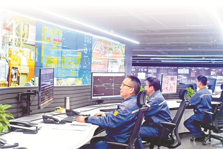 福建省宝钢德盛精品不锈钢绿色产业基地内,工作人员正在通过工业互联网系统远程操作进行炼钢。刘其燚 摄