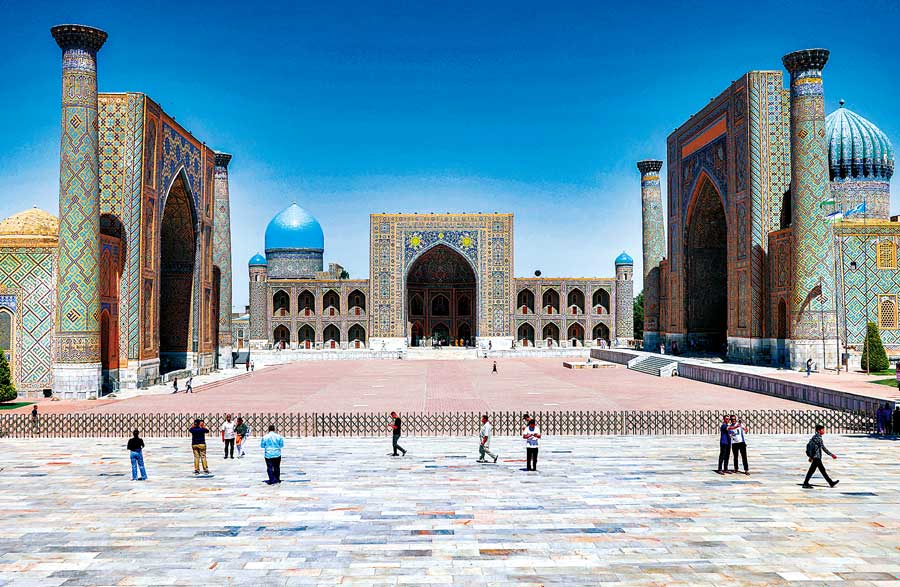 图为日前,人们在乌兹别克斯坦撒马尔罕市列吉斯坦广场游览。(图片来源:视觉中国)