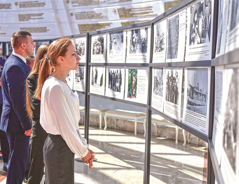 定格共同的胜利,重温跨越时空的二战记忆。“铭记历史 开创未来”——纪念中国人民抗日战争暨世界反法西斯战争胜利80周年图片展正在白俄罗斯国立伟大卫国战争历史博物馆展出。图为观众在参观展览。新华社记者 张超群 摄