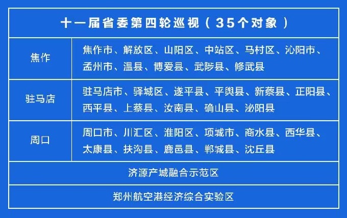 十一届河南省委第三轮巡视工作圆满收官,第四轮巡视正式启动,7个省辖市及所辖县(市、区及功能区)、济源产城融合示范区、郑州航空港经济综合实验区接受“政治体检”。