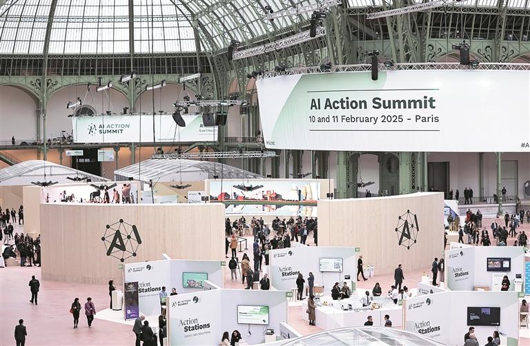 图为2月10日,在法国巴黎大皇宫拍摄的人工智能行动峰会现场。 新华社记者 高静 摄