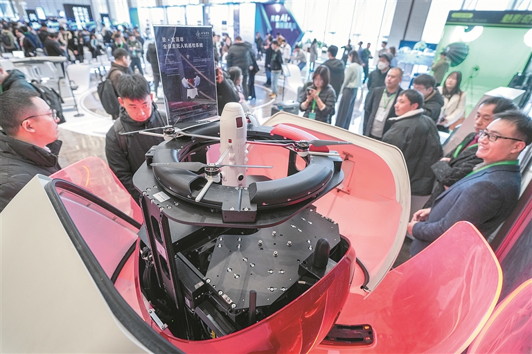 2月14日,2025年苏州市“人工智能+”创新发展推进大会暨人工智能赋能新型工业化深度行(苏州站)活动举行。图为当日,观众在活动现场参观全自主无人机巡检系统。 新华社记者 李博 摄