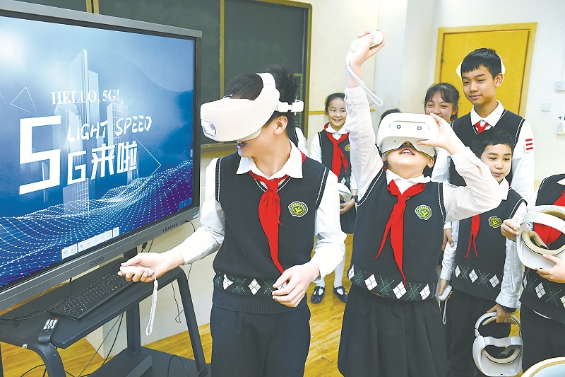 在四川省成都市高新区益州小学5G智慧教室,小学生通过VR头显感受虚拟现实场景。(图片来源:视觉中国)