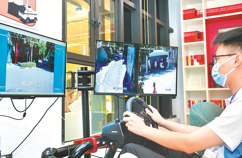 福建省福州市仓山区中天社区,工作人员远程操作5G机器人。石美祥摄