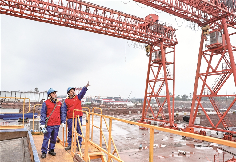 春节前夕,国家电网四川省华蓥市供电公司共产党员服务小分队奔忙在西渝高铁广安东站制梁场施工现场,巡检供电设施设备。