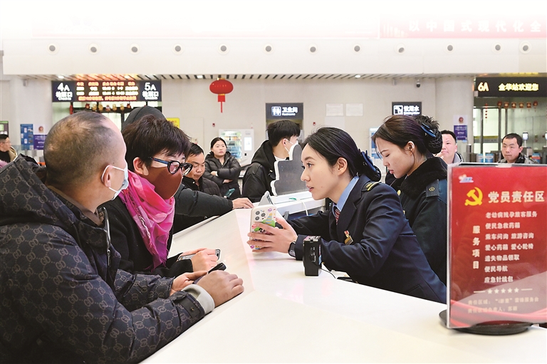 1月14日,浙江金华,铁路金华站候车大厅共产党员责任区,工作人员正在提供咨询服务,温暖旅客回家路。 图片来源:视觉中国