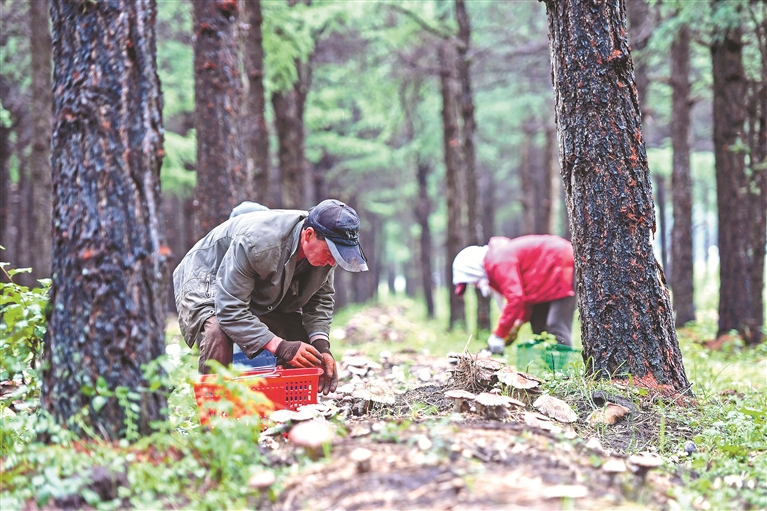工人在内蒙古自治区克什克腾旗桦木沟林场种植基地内采摘大球盖菇。新华社记者 刘磊 摄