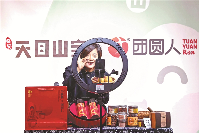 浙江省杭州市临安区一家山核桃加工企业的直播间内,主播正在推销山核桃产品。 浙江省杭州市临安区农业农村局供图