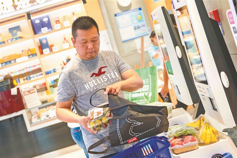 上海一家超市内,消费者在使用自带的购物袋装购买的物品,减少塑料袋的使用。图片来源:视觉中国
