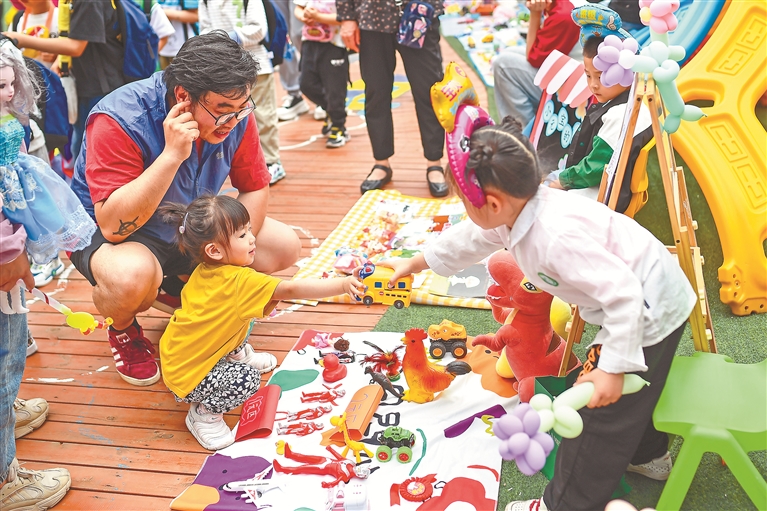 山西省太原市,家长带着孩子们把家中闲置的书籍、玩具拿到“跳蚤市场”上进行销售和交换。图片来源:视觉中国