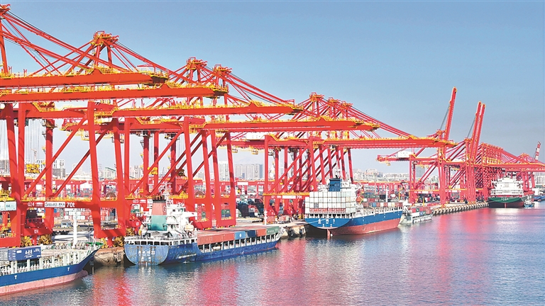 2023年山东日照港完成货物吞吐量5.22亿吨,同比增长4.1%;集装箱吞吐量626万标箱,同比增长7.9%。图为1月10日,山东港口日照港集装箱码头。新华社记者 郭绪雷 摄