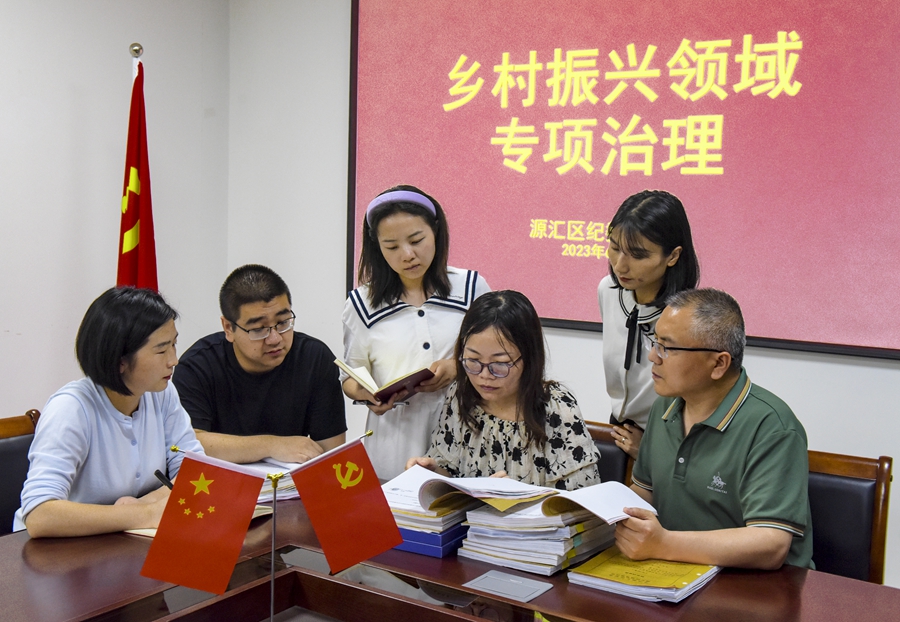 河南省漯河市源汇区纪委监委启动乡村振兴领域不正之风和腐败问题专项整治,严肃查处侵害群众利益的腐败和作风问题,图为该区纪委监委干部集体分析研判乡村振兴领域案件卷宗。尤亚辉 摄