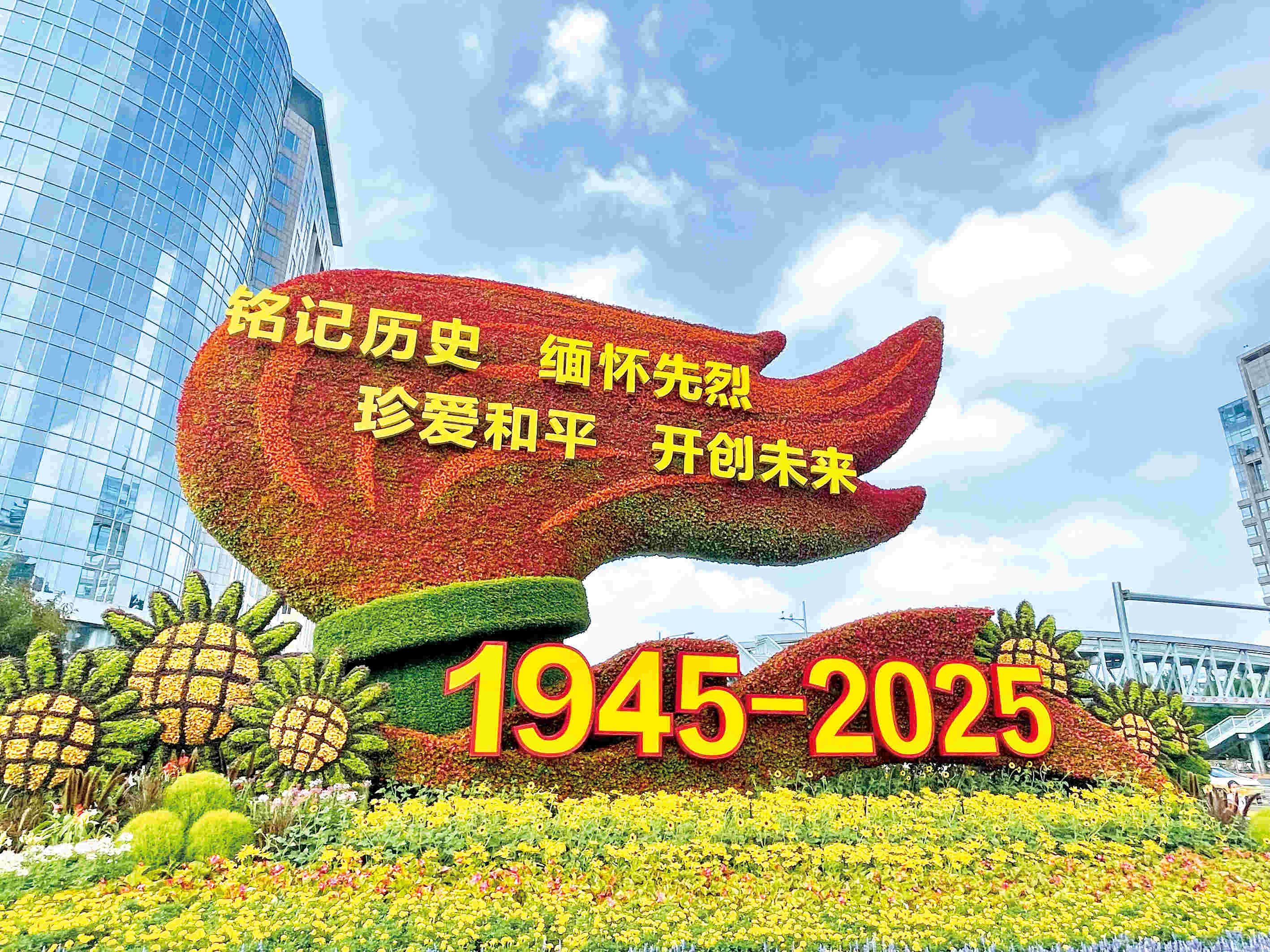 图为纪念中国人民抗日战争暨世界反法西斯战争胜利80周年主题花坛。