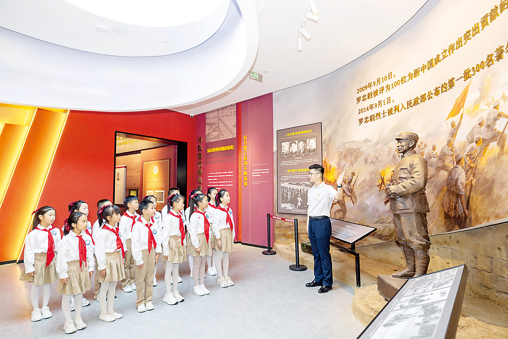 8月27日,湖北省襄阳市襄城区开展“从抗战史诗到少年担当”主题教育活动,组织学生们走进襄阳革命烈士纪念馆,聆听抗战英雄的故事。图为宣讲员向学生们讲述抗战英雄罗忠毅的故事。 图片来源:视觉中国