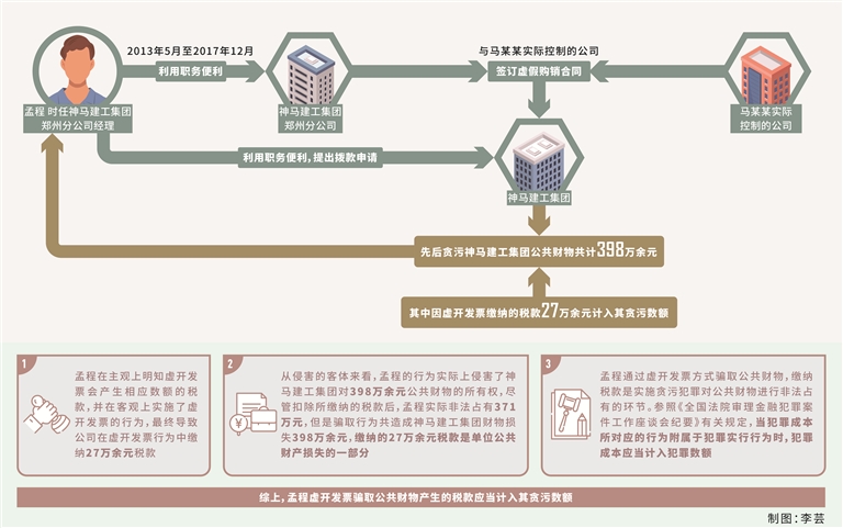 胡艳彬:刑法第三百八十二条规定,国家工作人员利用职务上的便利,侵吞、窃取、骗取或者以其他手段非法占有公共财物的,是贪污罪。本案中,孟程作为神马建工集团郑州分公司经理,利用公司所有经营活动和开支都需由经理签批的便利条件,监守自盗,先后3次以签订虚假购销合同、虚开发票的方式,骗取神马建工集团公共财物398万余元的行为系贪污。有观点认为,这398万余元中包含虚开发票产生的税款27万余元,这笔税款已经通过税务机关上缴财政,孟程并没有实际非法占有,不应当计入贪污数额。我们未采纳该观点,理由如下:
