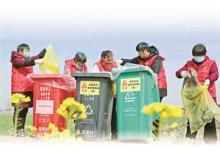 江苏省海安市墩头镇志愿者捡拾并分类回收农资废弃物。图片来源:视觉中国