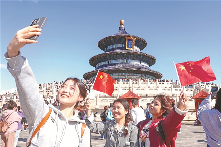 2024年7月,“北京中轴线——中国理想都城秩序的杰作”被列入《世界遗产名录》,北京中轴线上的各个遗产点也迎来了游览高峰。图为游客在天坛公园祈年殿前游览。新华社发