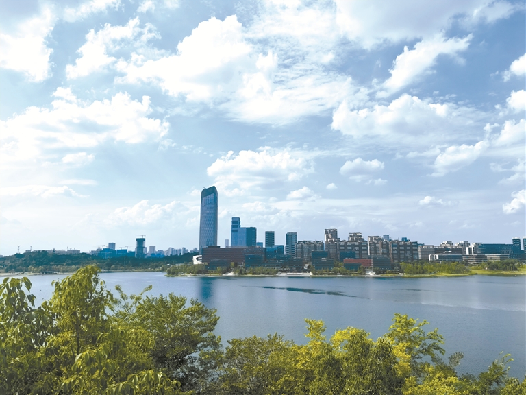 从兴隆湖南岸远眺,波光潋滟、鹭鸟翔集,临湖而建的新经济产业园、成都科学城,高楼林立、错落有致。有别于传统摊大饼式发展模式,天府新区划定72.1%的蓝绿空间,最大限度保留原有地势地貌,沿鹿溪河自北向南布局天府总部商务区、成都科学城、天府数字文创城三个城市组团,组团之间由生态廊道相连。在组团内部,划分公园片区、公园社区、公园街区,将城市绿地和公园系统全方位融入整体生态格局。