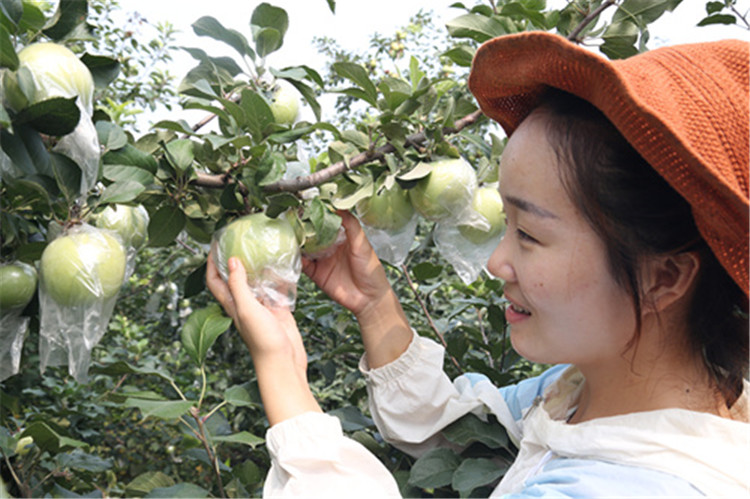 望着挂满枝头的苹果,农家小妹笑逐颜开,丰收的喜悦写在脸上。