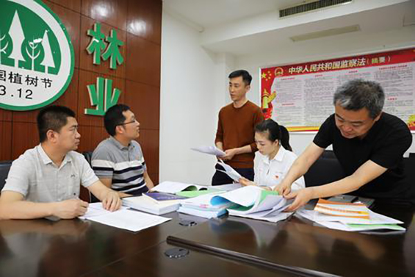 图为河南省荥阳市纪委监委工作人员对该市林业局以案促改工作进行“回头看”,监督检查制度完善落实情况。 宋志远 摄