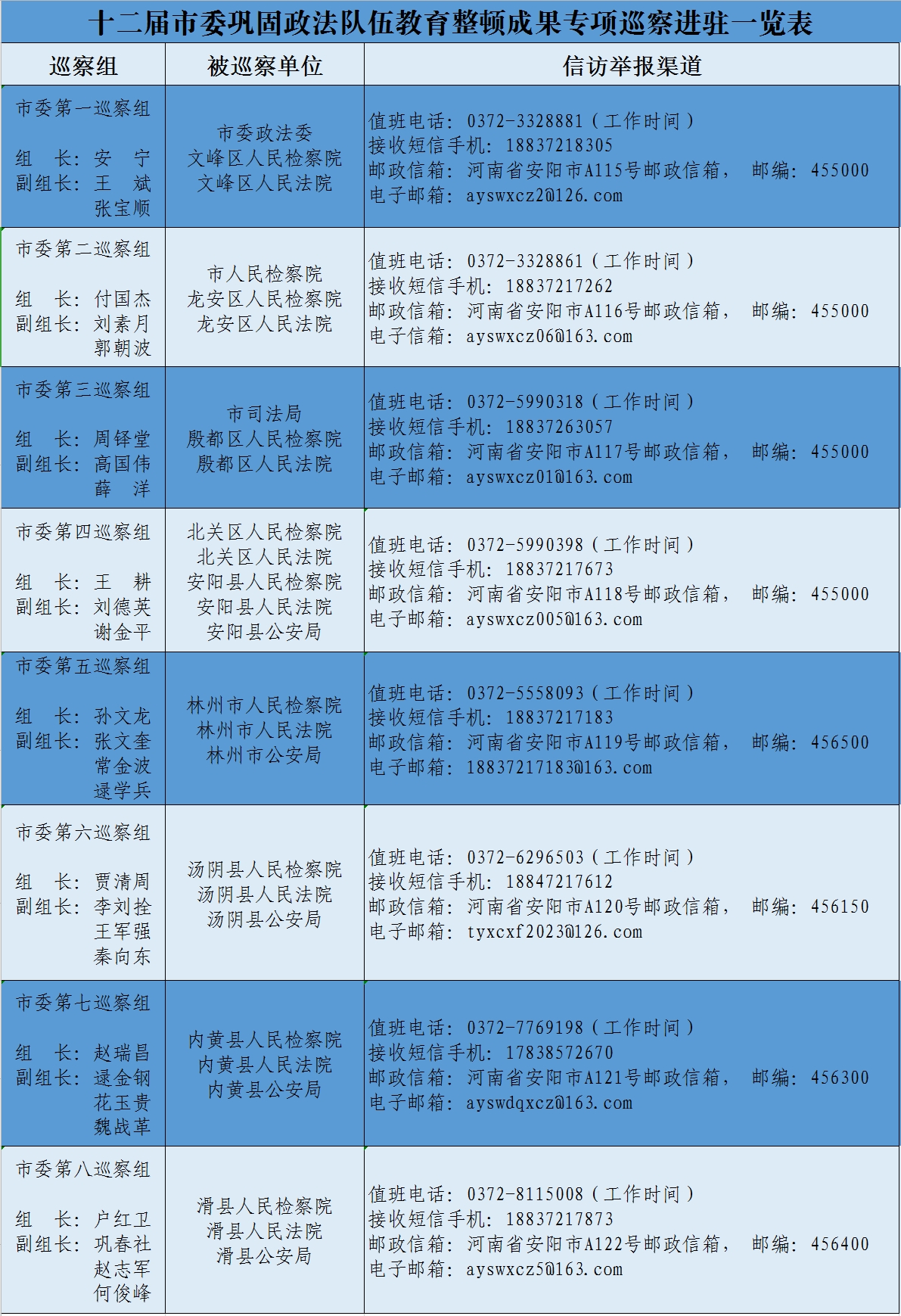 根据省委和市委统一部署,截至11月11日,十二届市委巩固政法队伍教育整顿成果专项巡察8个巡察组完成对市委政法委、市人民检察院、市司法局,各县(市、区)人民法院、人民检察院、公安局等26家单位的巡察进驻。