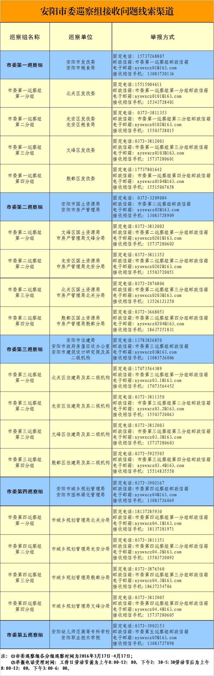 根据安阳市委统一部署,市委巡察组于2016年3月17日至5月17日对市发展和改革委员会、市住房和城乡建设局、市国土资源局、市城乡规划管理局及各县(市、区)直、乡镇(街道)对口单位;根据省委巡视办《关于安排对以省辖市为主办学专科院校开展巡察工作的通知》要求,同时对安阳幼儿师范高等专科学校、安阳职业技术学院进行专项巡察。