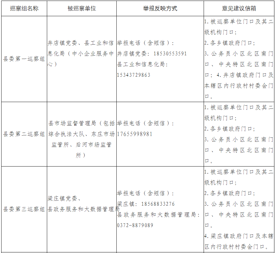 根据县委统一部署,2022年7月中旬至9月中旬,县委5个巡察组将对3个乡镇党委、6个县直单位党组织开展十三届县委第三轮巡察工作,分别为:1.井店镇党委;2.梁庄镇党委;3.宋村乡党委;4.县工业和信息化局(中小企业服务中心);5.县人力资源和社会保障局;6.县市场监督管理局(包括综合执法大队、东庄市场监管所、后河市场监管所);7.县医疗保障局;8.县政务服务和大数据管理局;9.县融媒体中心。现将有关事项公告如下: