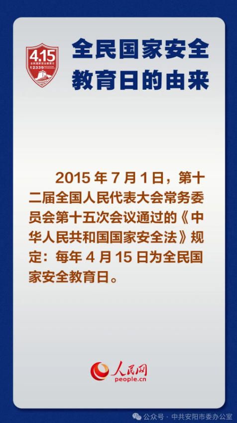 2014年4月15日,习近平总书记主持召开中央国家安全委员会第一次会议并发表重要讲话。他指出,我们要准确把握国家安全形势变化新特点新趋势,坚持总体国家安全观,走出一条中国特色国家安全道路。2015年7月1日,第十二届全国人大常委会第十五次会议通过《中华人民共和国国家安全法》,将每年4月15日确定为全民国家安全教育日。