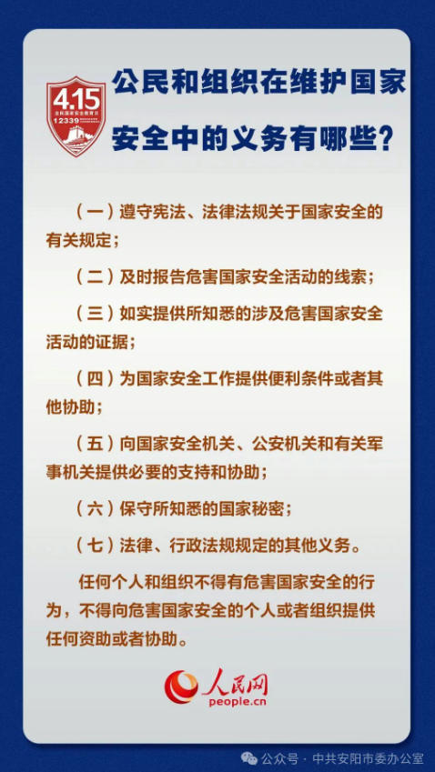 《国家安全法》第七十七条规定,公民和组织应当履行下列维护国家安全的义务: