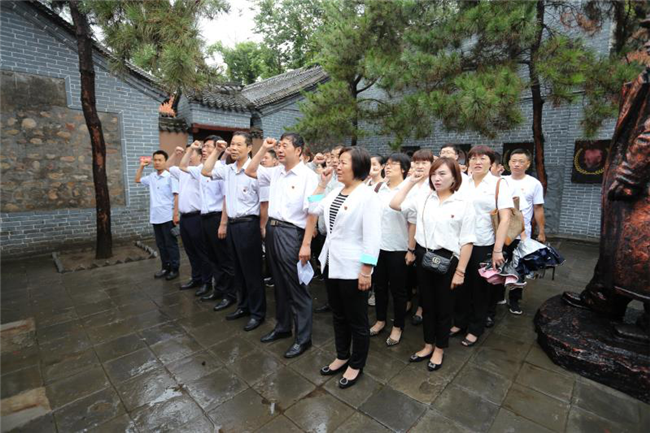 活动中,全体党员干部依次参观了“党性考验”“党性修养”“党性展现”“党性锻炼”四个展室,感受当年烽火岁月里刘少奇和其他兵站同志艰苦奋斗的工作场景。大家认真聆听讲解,仔细观看陈列实物,悉心了解刘少奇先进事迹,静心感受他一心为民的高尚情操、艰苦朴素的优良传统和为党的事业奋斗终身的革命情怀,在心灵上接受了一次革命传统教育洗礼。随后,在刘少奇旧居院内,全体党员重温入党誓词。