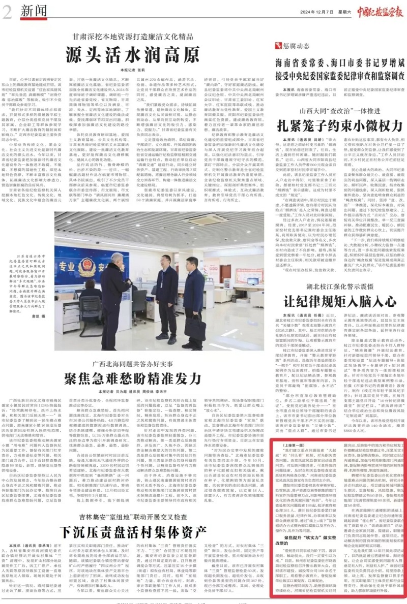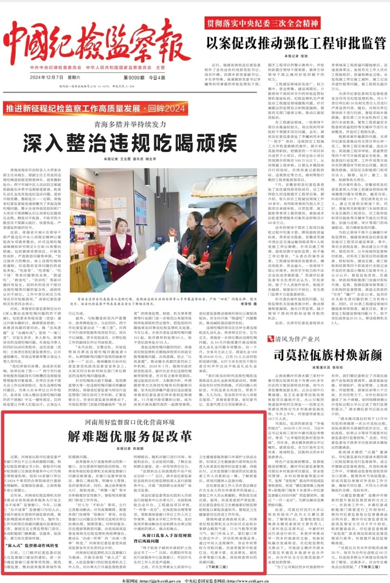 12月7日,中国纪检监察报头版刊发《河南用好监督窗口优化营商环境 解难题优服务促改革》,报道河南纪检监察机关以强化“办不成事”监督窗口为切入点,持续开展优化营商环境监督治理,聚焦影响营商环境的不作为、慢作为、乱作为和背后风腐问题强化监督执纪问责,督促压实主管监管部门责任,推动职能部门解难题、优服务、促改革,着力优化营商环境的生动实践。