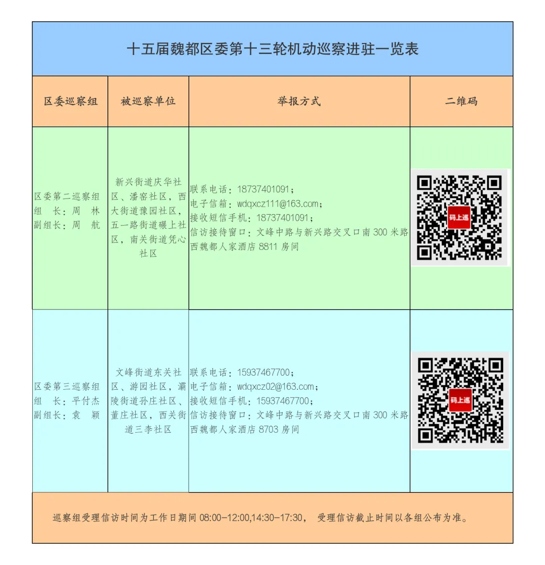 巡察期间,区委各巡察组开通专门联系电话、专用电子信箱、“码上巡”等信访举报方式,主要受理反映被巡察党组织领导班子及其成员,下一级党组织主要负责人和重点岗位人员问题的来信来电来访,重点是关于违反政治纪律、组织纪律、廉洁纪律、群众纪律、工作纪律和生活纪律等方面的举报和反映。对其他不属于巡察受理范围的信访问题,请按规定向有关部门反映。