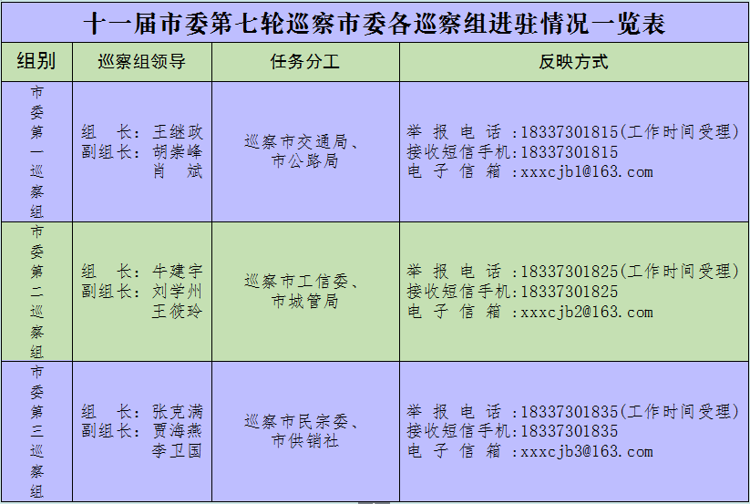 巡察期间,市委各巡察组均开通联系电话、接收短信手机、电子邮箱,并在被巡察单位显著位置设立举报信箱,接收关于被巡察单位党组织领导班子及其成员、下一级党组织领导班子主要负责人和重要岗位领导干部的反映,重点是关于违反政治纪律、组织纪律、廉洁纪律、群众纪律、工作纪律和生活纪律等方面的举报和反映,受理时间为工作时间。巡察结束后,上述反映问题方式自动关闭。对与巡察工作无直接关系的个人诉求、涉法涉诉等信访问题,将按规定转交被巡察单位和有关地方、部门处理。