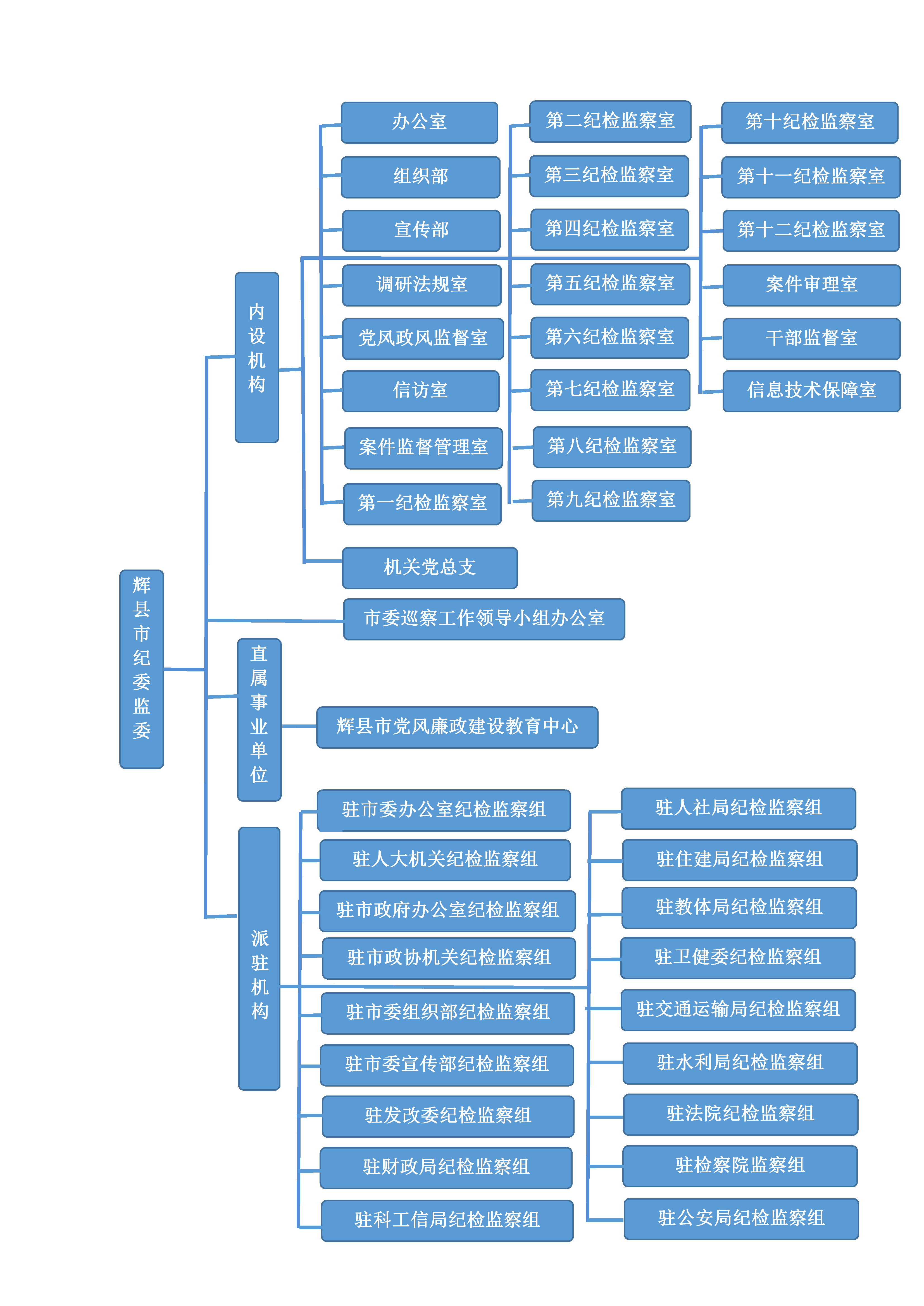 中国共产党辉县市纪律检查委员会机关与辉县市监察委员会合署办公,共有22个内设机构,分别为:办公室、组织部、宣传部、调研法规室、党风政风监督室、信访室、案件监督管理室、第一纪检监察室、第二纪检监察室、第三纪检监察室、第四纪检监察室、第五纪检监察室、第六纪检监察室、第七纪检监察室、第八纪检监察室、第九纪检监察室、第十纪检监察室、第十一纪检监察室、第十二纪检监察室、案件审理室、纪检监察干部监督室、信息技术保障室。内设机关党总支,所属1个事业单位:辉县市党风廉政建设教育中心。实现统一管理的派驻机构18个。市委巡察工作领导小组办公室设在市纪委。