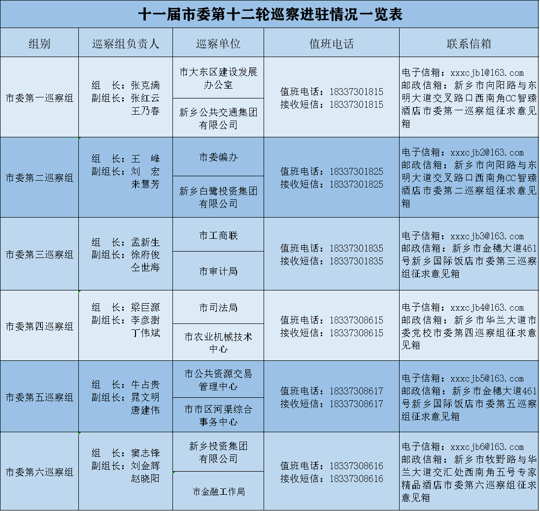 按照市委统一部署,十一届市委第十二轮巡察将对市委编办、市工商联、市审计局、市金融工作局、市大东区建设发展办公室、新乡投资集团有限公司、新乡白鹭投资集团有限公司7家单位党组织开展常规巡察,对市司法局、市公共资源交易管理中心、新乡公共交通集团有限公司3家单位党组织开展巡察“回头看”,对市农业机械技术中心、市市区河渠综合事务中心2家单位党组织开展“点穴式”巡察。