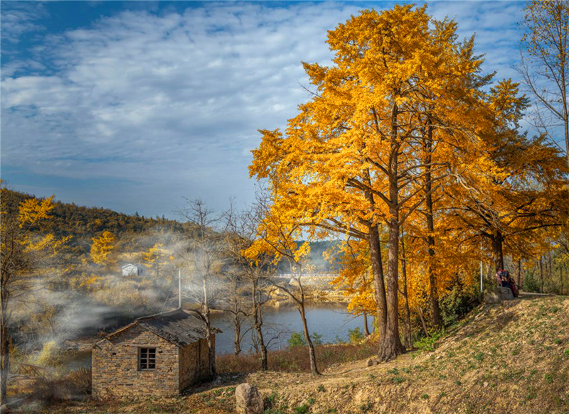 深秋时节,草木金黄,远山环绕下的几户人家炊烟袅袅,远远望去,宛若一幅灵动的秋意图。(新密市纪委监委 朱留波 摄)