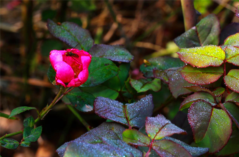 霜降前后的清晨,寒露伏在叶片上,似镶满了水晶一般晶莹剔透,花朵在它的映衬下也显得越发灵动和鲜艳。(焦作市山阳区纪委监委 武艳峰 摄)