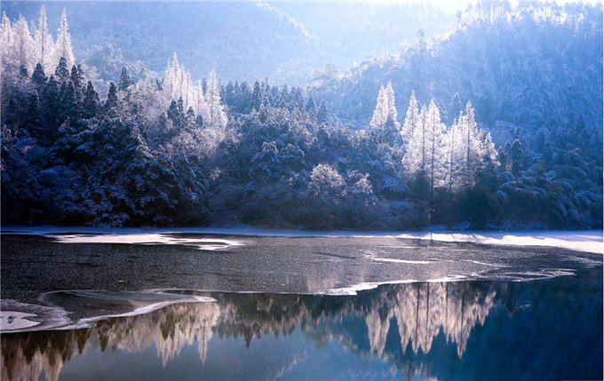 “天水清相入,秋冬气始交。”立冬之际,大别山腹地的黄柏山国家森林公园提早进入寒冬。无念湖畔的松柏树林披上重霜,静谧明澈的湖面像是一面银镜,倒映着四周的美景。 (商城县纪委监委 廖煜 摄)