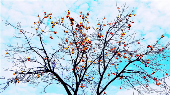 冬已至,秋已远。树上的叶子慢慢被秋风扫尽,挂满枝头的柿子似火炬、似灯笼,在蓝天白云的映衬下,组成一幅色彩鲜亮的初冬画卷。(商水县纪委监委 郭俊典 摄)