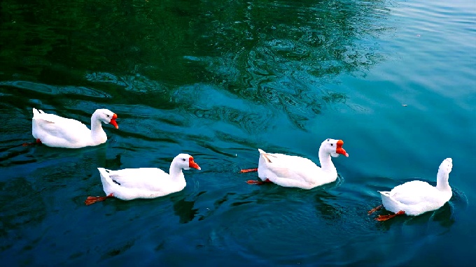 立春日,灵宝市金水湖公园里,几只大白鹅惬意地游弋在湖中,红色的掌子轻轻划动着水波,蔚蓝色的涟漪圈圈荡漾,好一幅鹅戏春水图!(灵宝市纪委监委 许晓珂 摄)