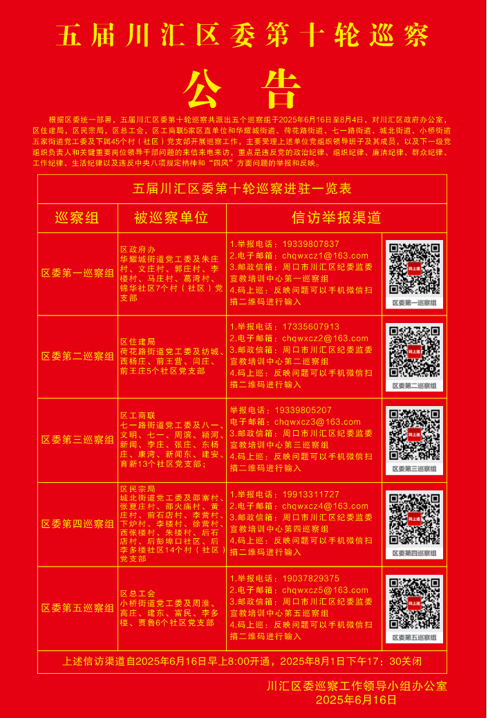 巡察进驻时间为2025年6月16日,2025年8月4日结束。其间,区委各巡察组均开通并公布接收举报电话、邮政信箱、码上巡,并在被巡察单位张贴巡察公告和设置巡察联系信箱。受理时间为工作日8:00-12:00,14:30-17:30。上述信访渠道自2025年6月16日开通,2025年8月1日17:30关闭。