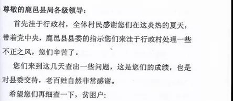 ·2019年7月11日,河南省鹿邑县张店镇洼于村群众以“洼于全体村民”名义,向县纪委监委驻村治理工作组写了一封举报信: